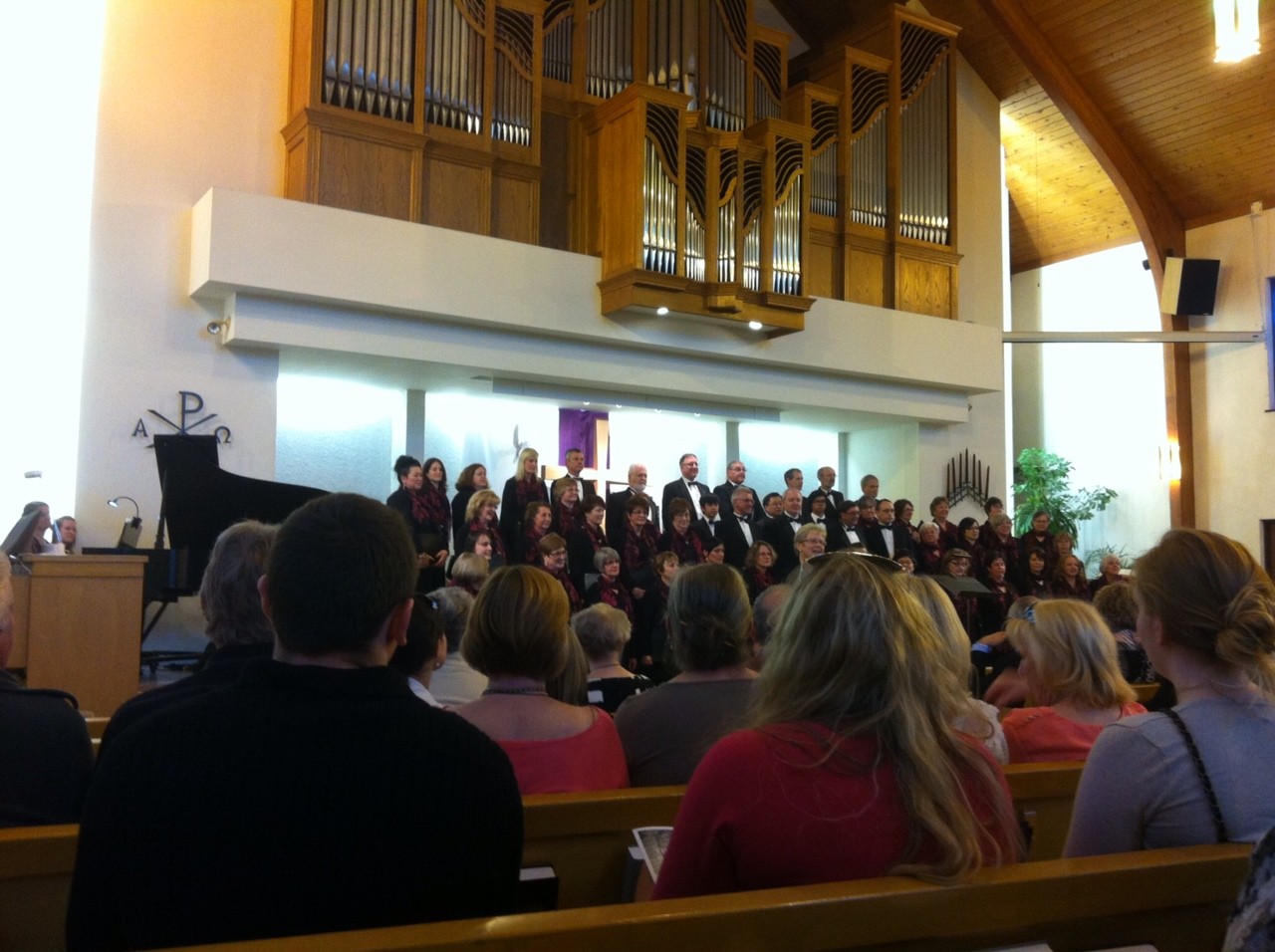 As I entered the church, I was impressed by the beautiful organ in the background. The singers walked down the aisle, and after a brief introduction about the singers and the work by their director, Dr. Ramona Luengen, the concert began. There was no intermission and the concert lasted about 80 minutes. Dr. Luengen joked that the singers had been on power bars for the past week to prepare for the long concert!